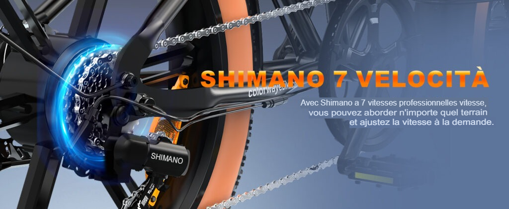 La transmission Shimano à 7 vitesses assure une adaptation fluide et précise à tout type de parcours.
