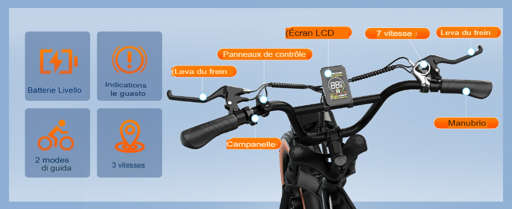 • Cadre en acier au carbone, freins à disque et écran LCD pour une conduite sûre et moderne.